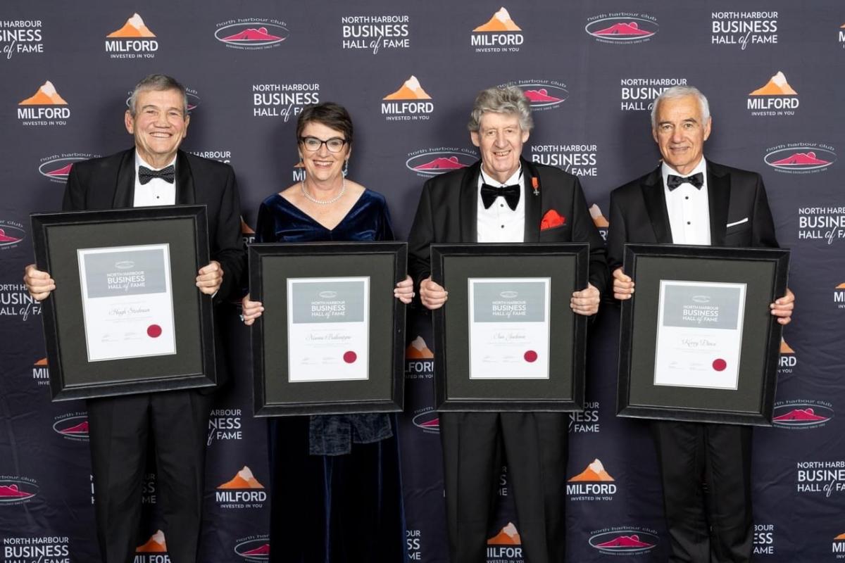 Four new laureates were inducted into the North Harbour Business Hall of Fame at a black tie function held at The Spencer Hotel in Takapuna in early November. The four were Naomi Ballantyne, Hugh Stedman, Ian Jackson and Kerry Dines. The event has been sponsored for many years by Milford Asset Management. MC for the evening was Rachel Smalley. Richard Pilley spoke on behalf of Milford Asset Management and the evening was kicked off by Mike Atkinson, President of the North Harbour Club and Charitable Trust.